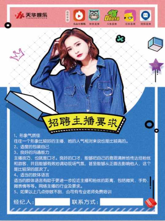 天华娱乐高薪招募主播啦!!如果你有才艺,长的好,会聊天,高智能,那就立刻我天华娱乐吧!!线上培养,线下包装,蜕变出最华丽的自己!!打造线上网红,提供线下演出资源,拍广告,上综艺,艺人路线不是梦!!只要你敢来,公司就敢捧,明星之路为你打开!!