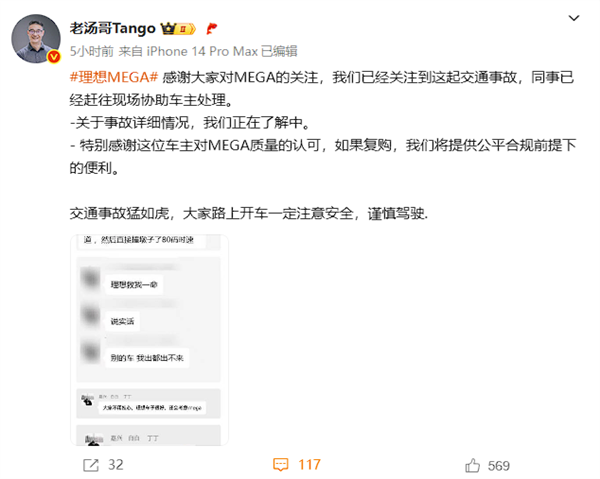 感谢大家对MEGA的关注,我们已经关注到这起交通事故,同事已经赶往现场协助车主处理,关于事故详细情况,我们正在了解中。