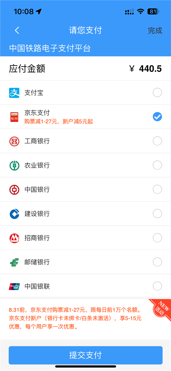 京东支付表示,即日起至8月31日,在12306买火车票并在支付订单页面选择“京东支付”,可享至高立减27元优惠,还可以先出行、后付款。