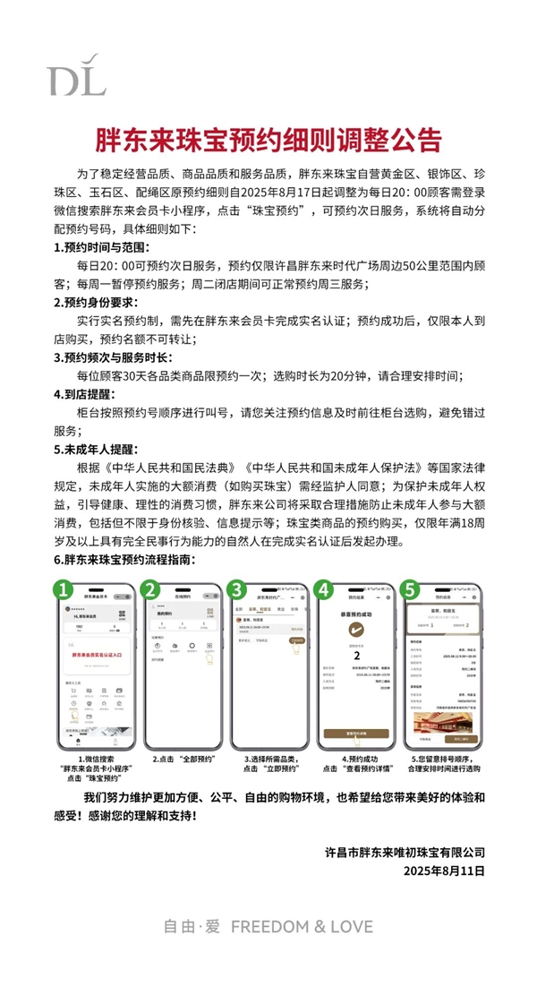公告自2025年8月17日起,胖东来珠宝自营黄金区、银饰区、珍珠区、玉石区、配绳区原预约细则,调整为每日20:00顾客需登录微信搜索胖东来会员卡小程序,点击预约版块,可预约次日服务,系统将自动分配预约号码。
