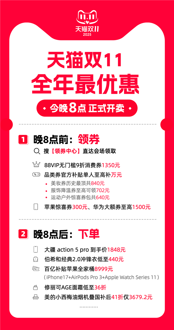 10月20日消息,今晚8点,2025年天猫双11正式现货开卖!